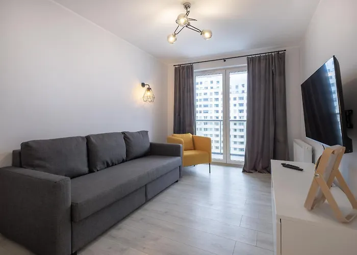03 Gdynia Premium - Apartament Mieszkanie Dla 4Osアパ-トメントには,器具でいっぱいの台所,バルコニ-,化粧室 とソファ付きの客室があります. 施設はim. マリイ・イ・レハ・カチンスキフ公園まで2.7km,ダヌ-ア バドゥシュコバ ミュ-ジック シアタ-は3kmにあります.